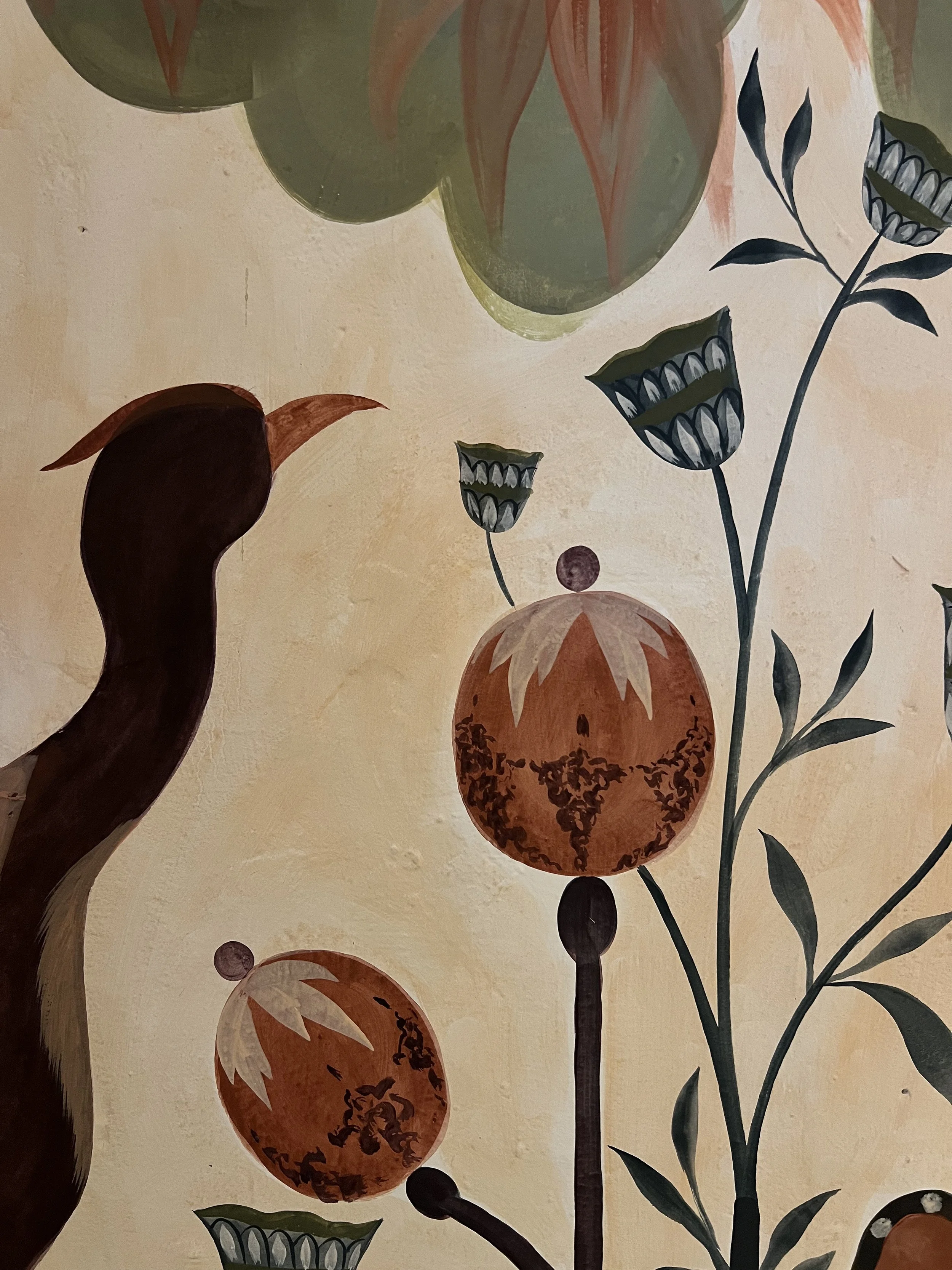 Franco German artist based in Brussels, Madeleine Schilling has been developing a practice focused on mural painting for several years. Her work is rooted in a sensitive observation of the living world, where flora and fauna are integrated into architecture as organic elements embedded in the memory of a place.